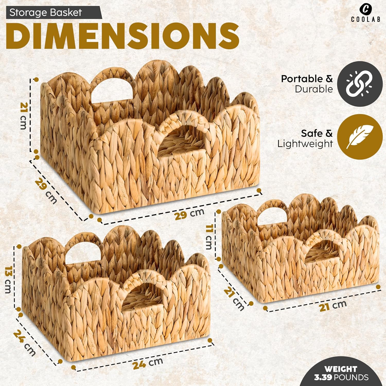 Our Elegant Scalloped Shelf Set with Handles offers a versatile and stylish storage solution for any space in your home. This set of three handwoven seagrass baskets comes in Large (29x29x15CM), Medium (24x24x13CM), and Small (21x21x11CM) sizes, ideal for organizing and decorating in the nursery, bathroom, living room, and beyond. Each wicker baskets for shelves features a distinctive scalloped edge, adding a touch of sophistication to shelves, tables, or corners while serving as both functional and decorative elements. Crafted from 100% natural seagrass, these eco-friendly baskets are durable and resilient, retaining their shape and strength even with daily use. Built-in handles make them easy to transport for any purpose, whether it’s storing towels, toys, or toiletries. Handcrafted by skilled artisans, the woven texture and natural seagrass color effortlessly complement a range of interior styles, from coastal and bohemian to rustic and modern. When not in use, the seagrass tray nests neatly within each other, saving valuable storage space—perfect for small homes or compact living spaces. These baskets make an ideal gift for decor enthusiasts and organizers, adding a timeless, high-quality touch to any room. Combining beauty, practicality, and artisanal craftsmanship, this rattan tray rectangle set is the perfect blend of form and function.