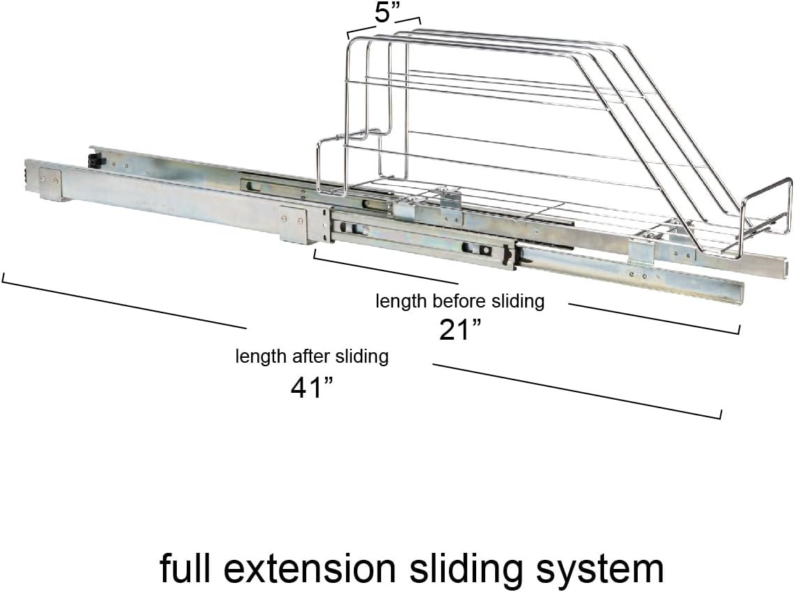 This innovative organizer is designed to bring efficiency and convenience to hard-to-reach spaces. With its cleverly crafted features and sturdy construction, it's the perfect solution for organizing cookware and bakeware. Each organizer offers three compartments to accommodate multiple pieces of cookware and bakeware. With ample space, pots, pans, baking sheets, and more can be easily arranged to remain within reach and neatly organized. Equipped with an easy-mount full-extension ball-bearing sliding base, this organizer ensures smooth and effortless access to kitchen essentials. No more rummaging through cluttered cabinets – simply slide out the organizer, and everything is readily accessible. Designed to fit most standard kitchen cabinetry, this organizer can be effortlessly mounted directly onto hard surfaces. Its versatile design makes it suitable for a range of kitchen layouts, allowing valuable storage space to be fully utilized. Crafted from high-quality, chrome-plated steel, this organizer is built to last. Its durable construction ensures stability and longevity, even when supporting heavy cookware. Base is fully assembled, simply insert the steel dividers and its ready to go. Installation is a breeze with mounting hardware included for convenience.