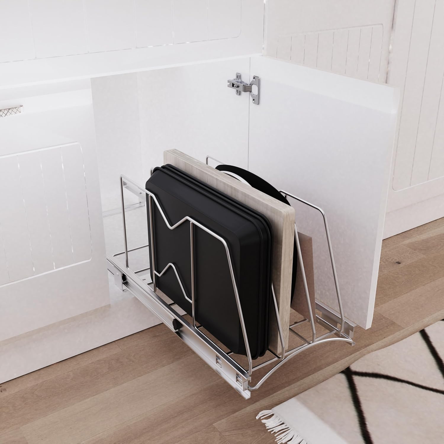Pull Out Cookie Sheet Organizer for Cabinet, Pan and Pot, Cutting Board, Bakeware, Tray Organizer Rack, Sliding Rack- Heavy Duty, Adjustable Divider Width, 10" W x 22" D x 11" H, Chrome