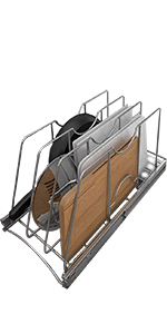 Cookware and bakeware organizer has tall heavy-duty dividers to keep everything organized and separated.